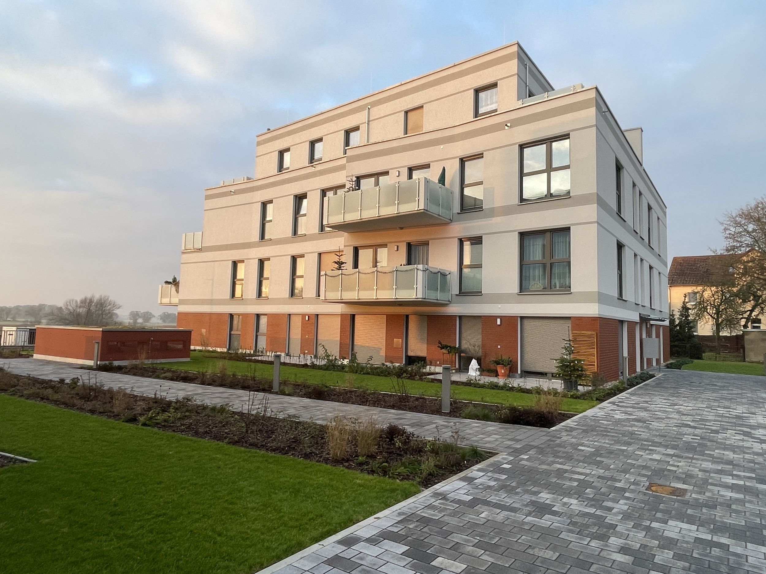 Der erste Bauabschnitt umfasst drei Wohngebäude mit insgesamt 44 Wohnungen. Sämtliche Wohnungen sind zur Elbe und zur weiten Auenlandschaft ausgerichtet. Eine gemeinsame Tiefgarage verbindet alle Gebäude. Sie ist als geschlossene Großgarage mit natürlichen Lüftungsöffnungen geplant. Das Dach der Tiefgarage bildet zwischen den Gebäuden eine begehbare, begrünte Innenhoffläche. Auch die Tiefgaragenzufahrt sowie die Lüftungselemente sind landschaftlich integriert und begrünt.