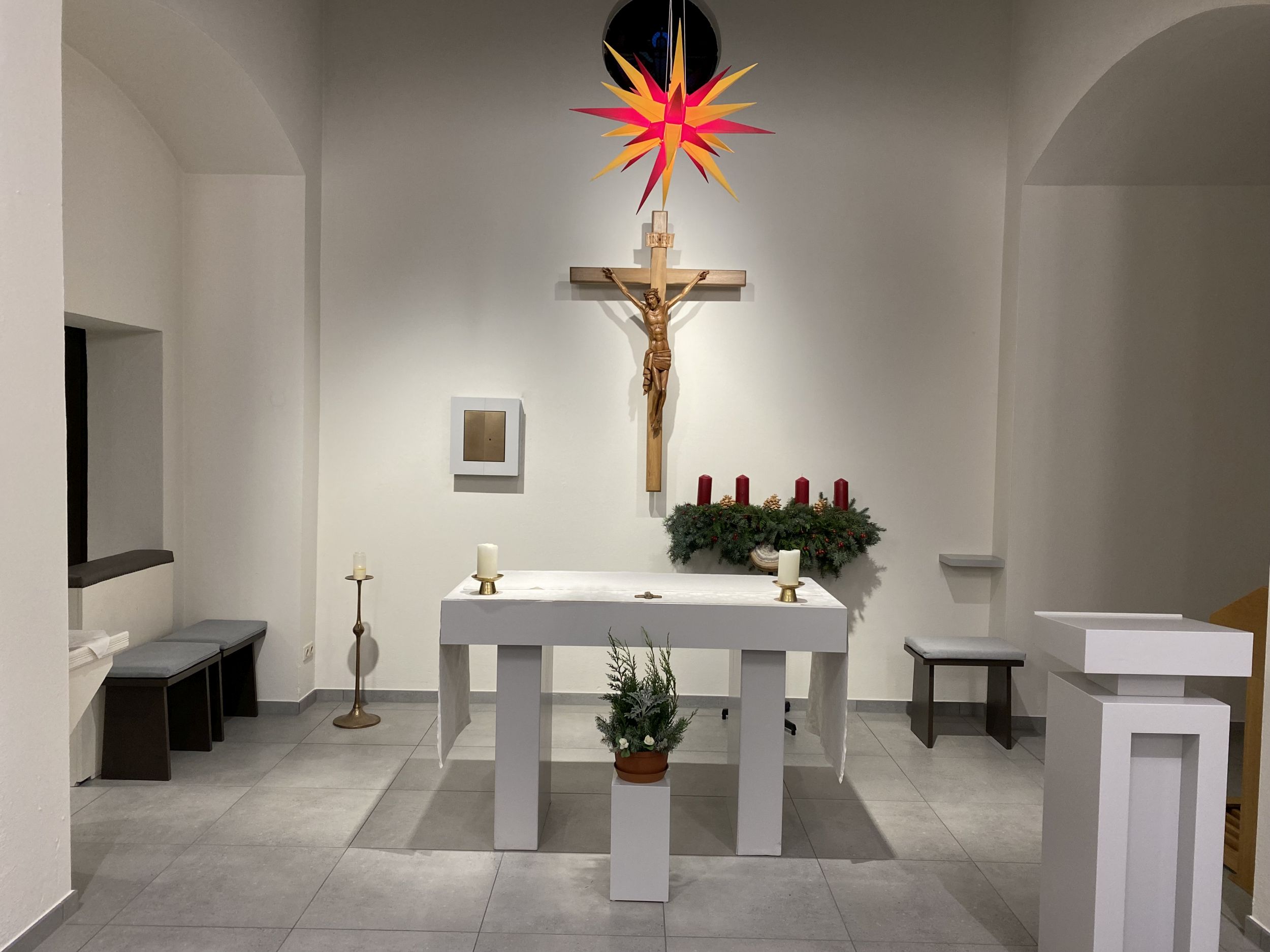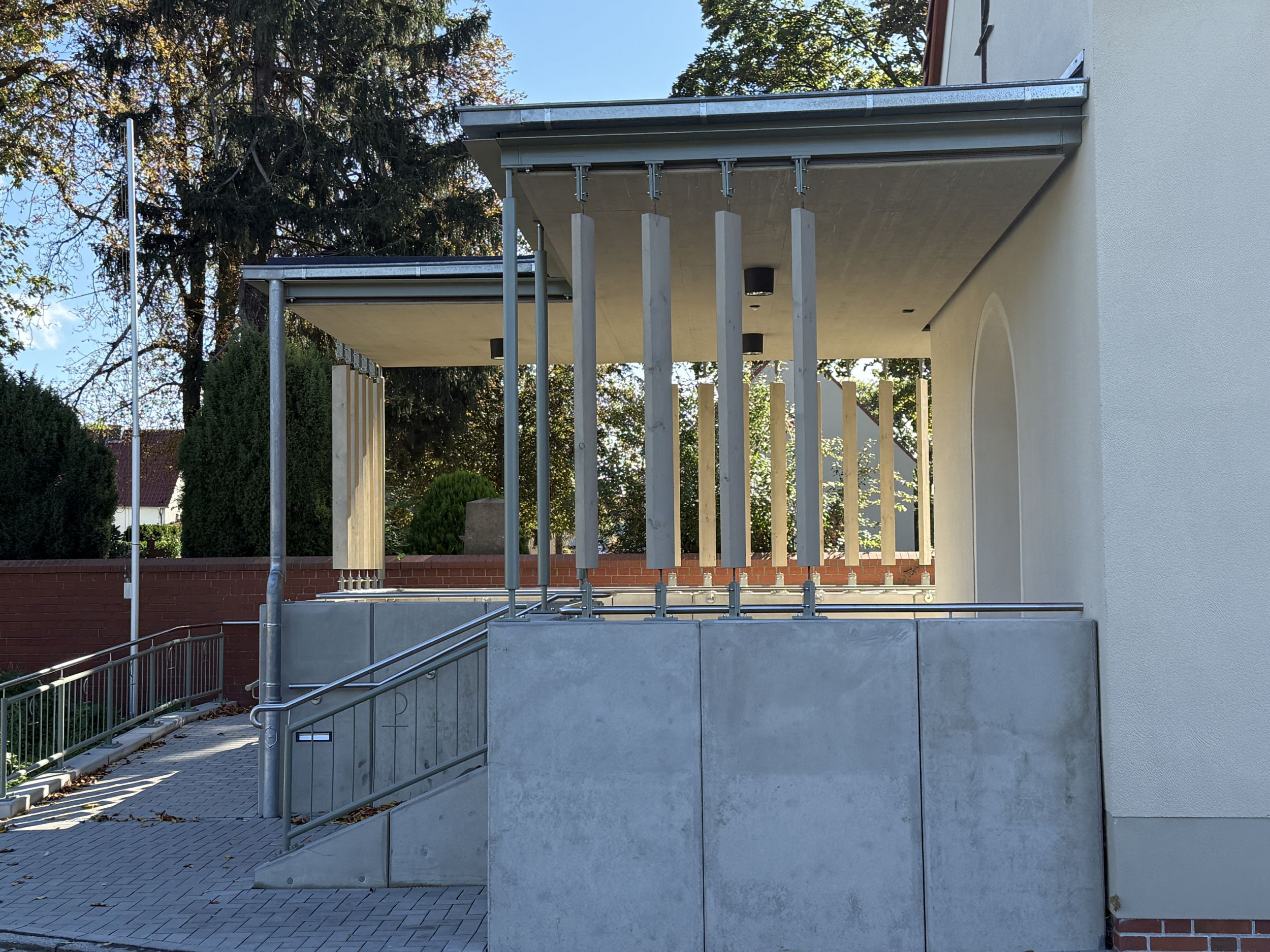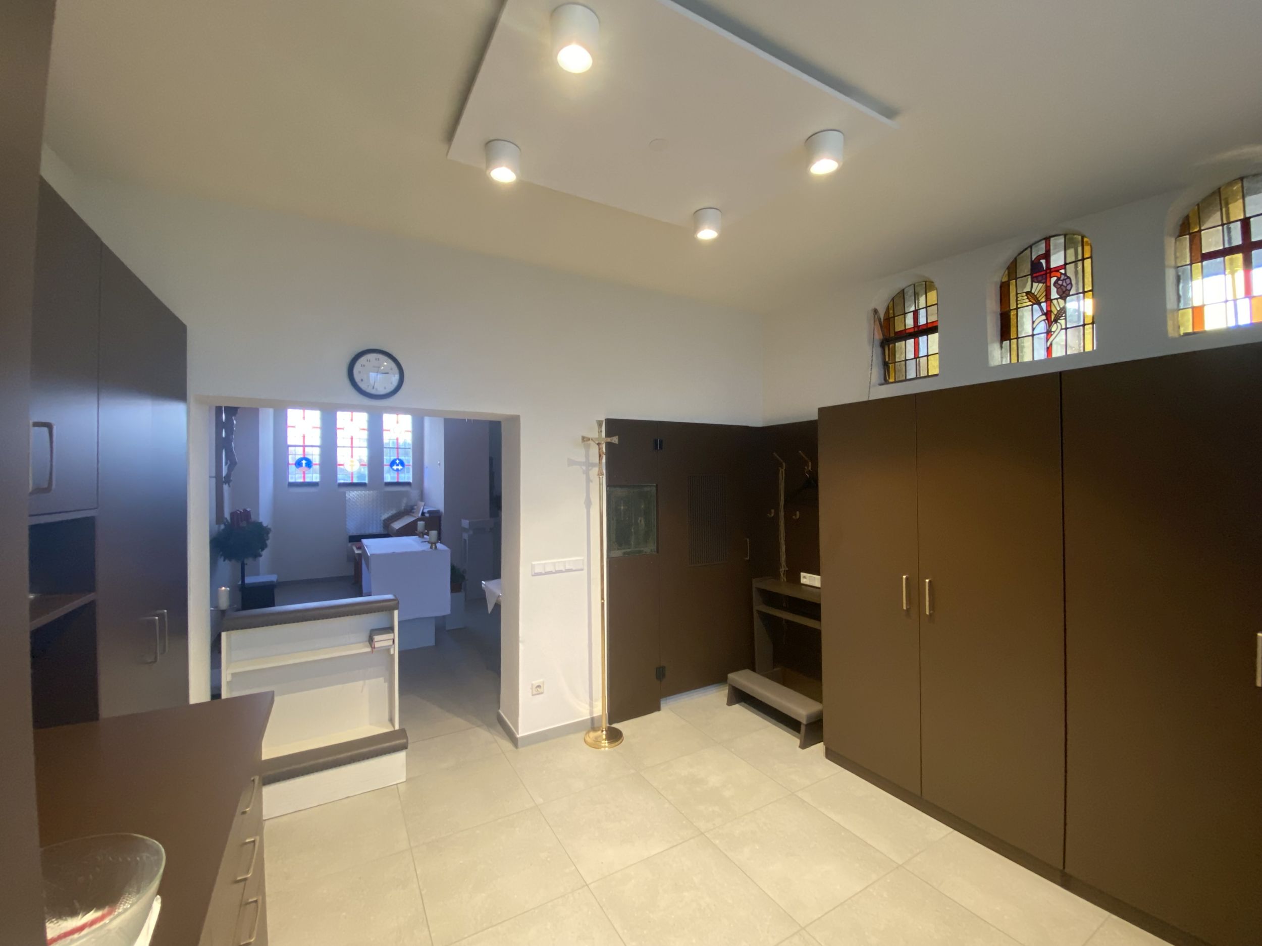 Im Rahmen der Sanierung der katholischen Kirche in Jessen wurde der gesamte Innenraum neu gestaltet und behutsam überarbeitet. Zentrales Element war die Neugestaltung der Farb- und Materialkonzeption des Kirchenraums sowie des liturgischen Mobiliars. Ambo, Tabernakel und weitere Ausstattungsgegenstände wurden teilweise neu entworfen oder gestalterisch überarbeitet und in ein neues Gesamtkonzept eingebunden. Auch die Sakristei einschließlich der Einbaumöbel wurde vollständig neu gestaltet und funktional angepasst. Im Anschluss an die Innenraumsanierung erfolgte die Instandsetzung der Kirchenfassade. Ergänzend wurde ein neuer barrierefreier Eingang mit einem überdachten Vorbereich geschaffen, der das Abstellen von Kinderwagen und Rollatoren ermöglicht und die Zugänglichkeit der Kirche nachhaltig verbessert.