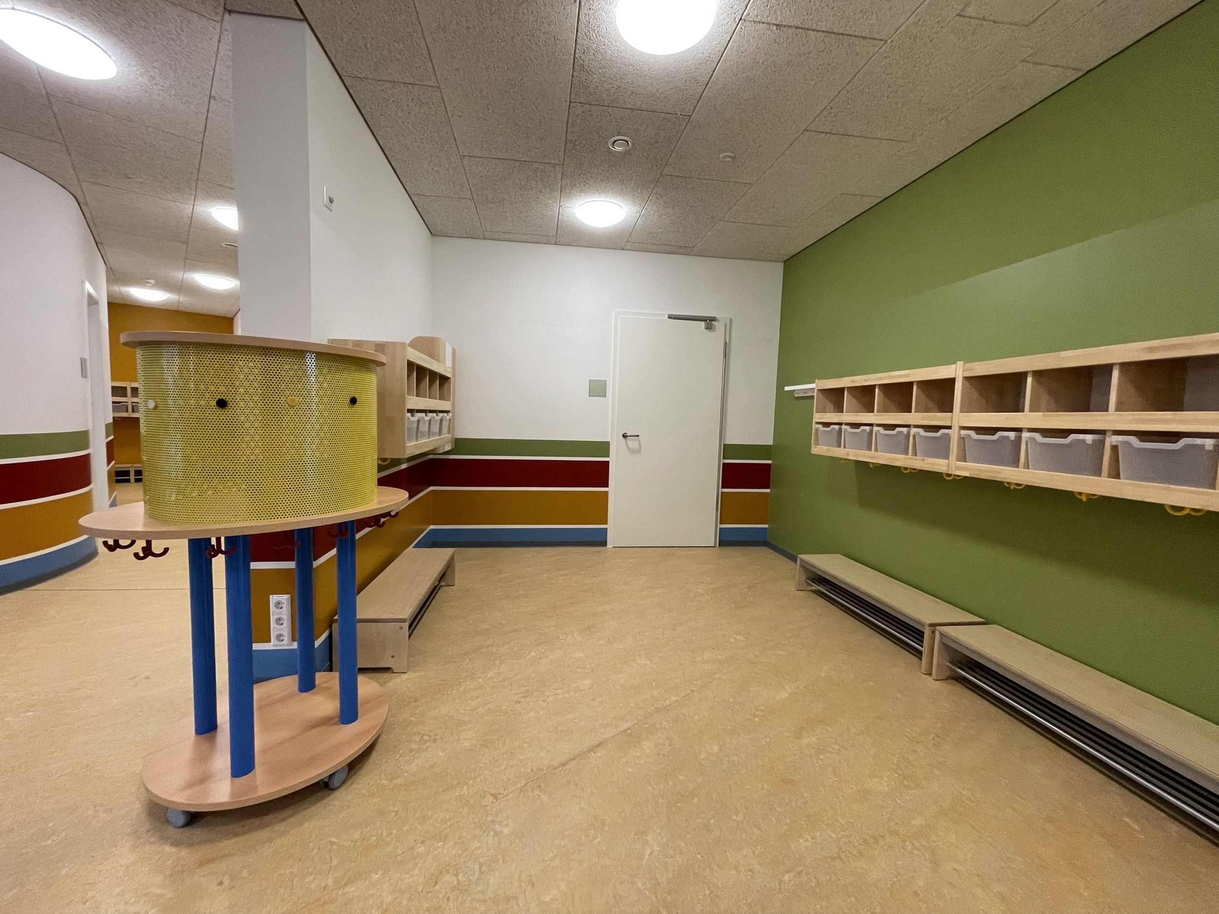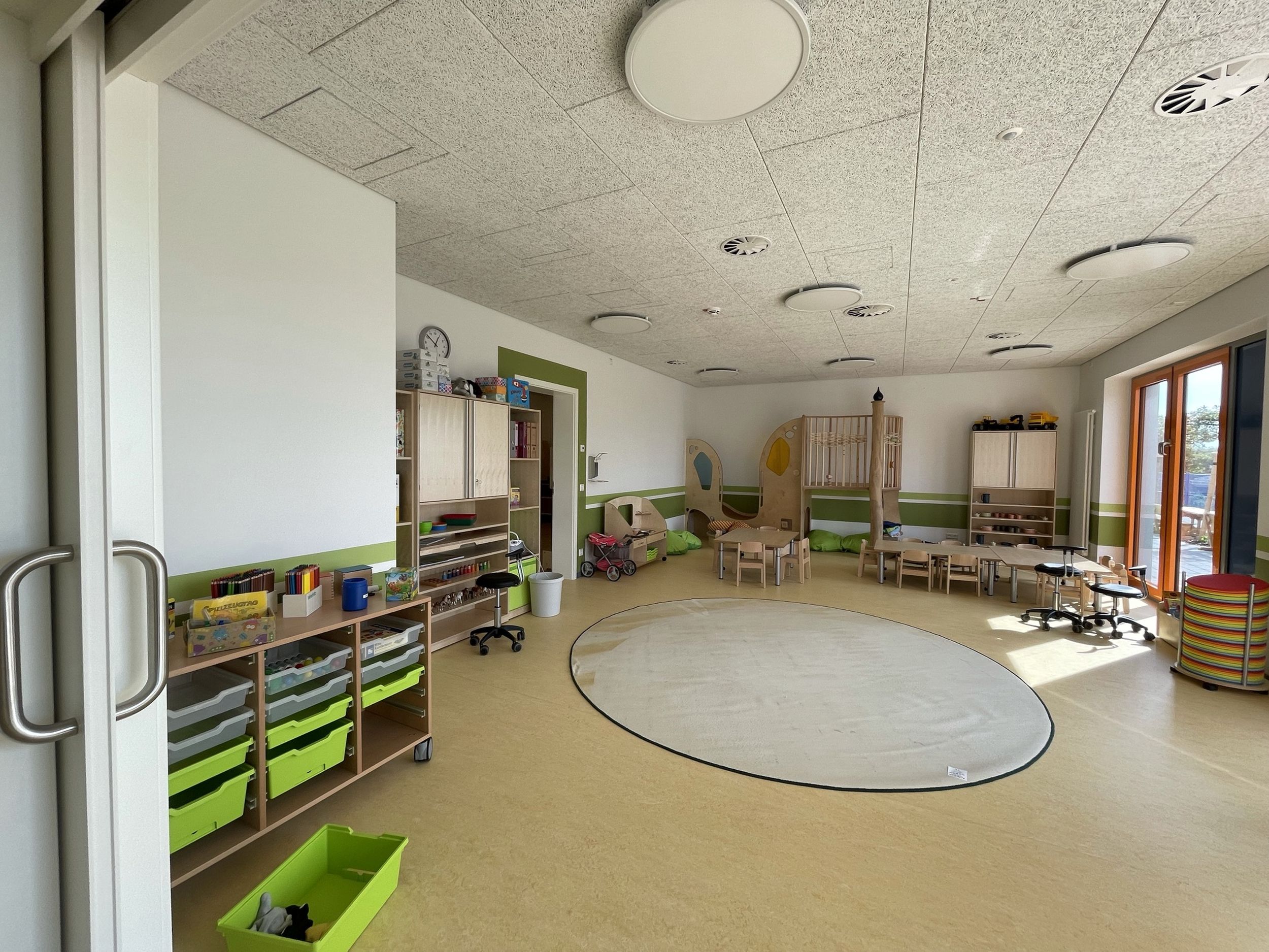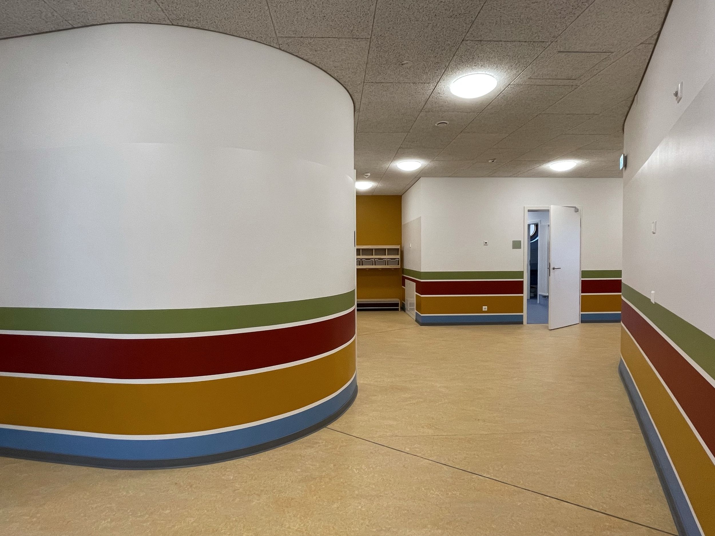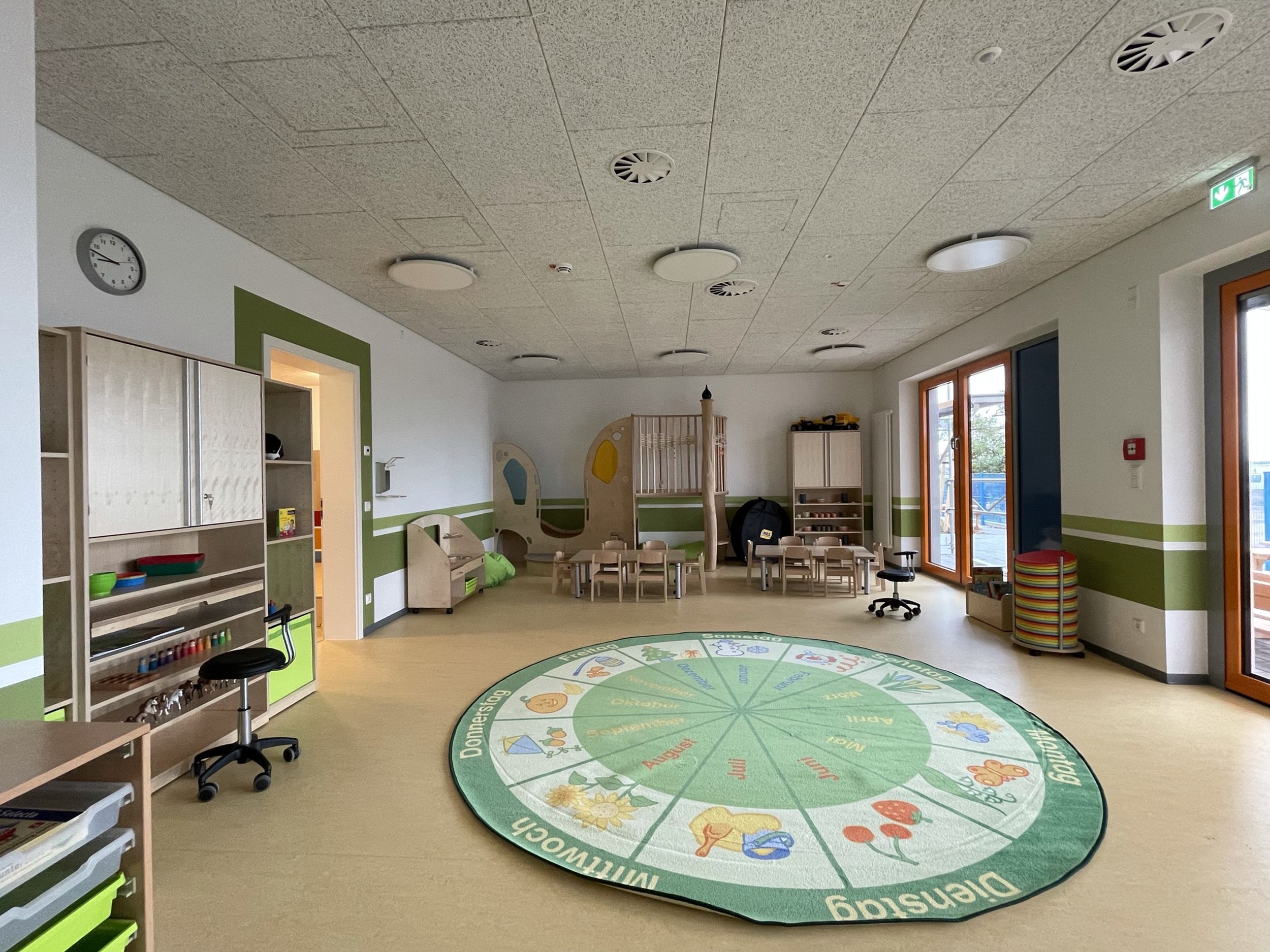 Das zweigeschossige Gebäude ist funktional gegliedert: Aufgrund des erhöhten Bedarfs an Betreuungsplätzen für Kinder unter drei Jahren ist das gesamte Erdgeschoss der Kinderkrippe (U3) vorbehalten. Das Obergeschoss wird über eine zentrale Treppe erschlossen; ein Aufzug stellt die Barrierefreiheit sicher.