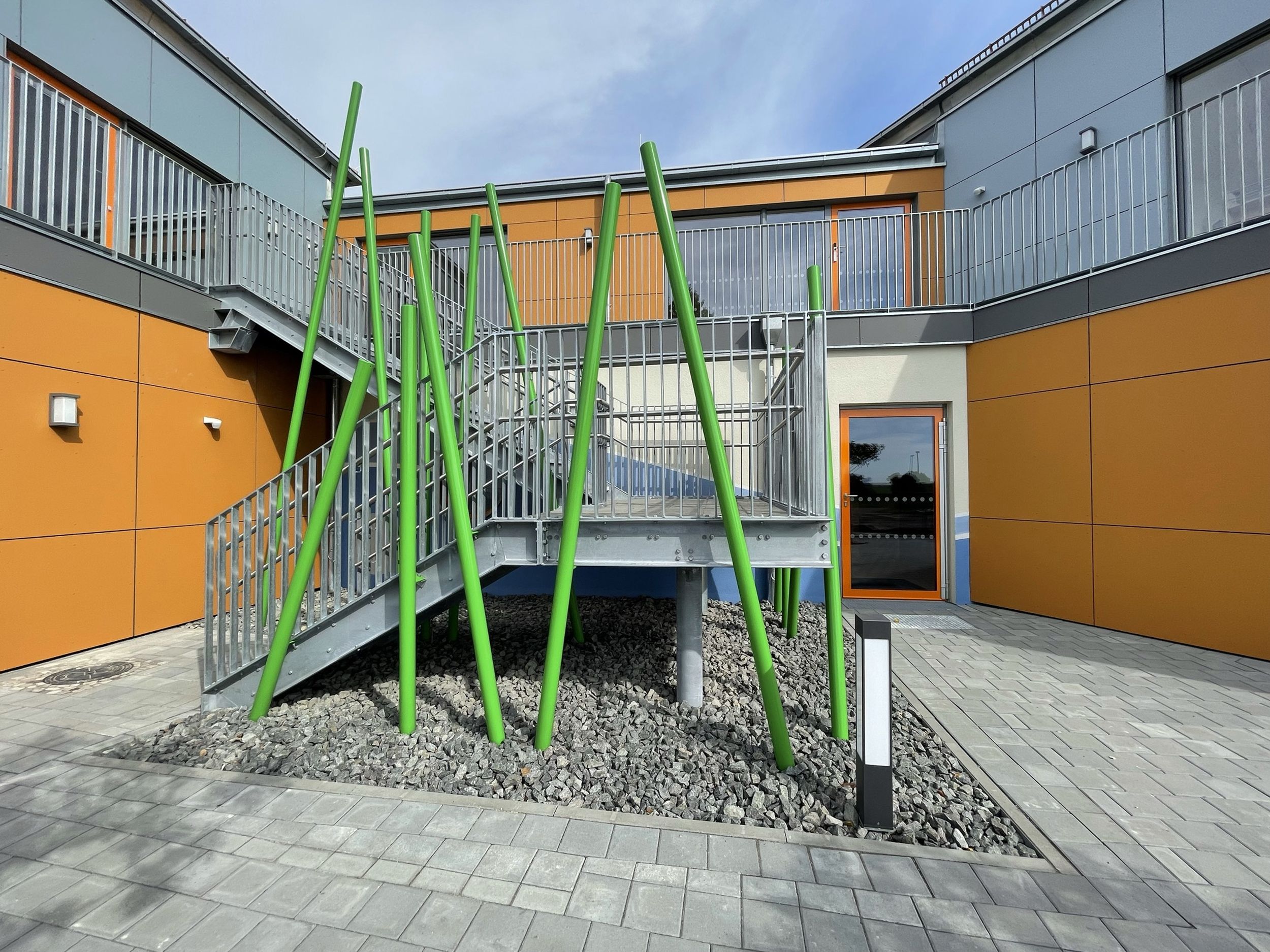 Hier befinden sich die Räume für Kinder über drei Jahren mit zwei flexibel nutzbaren Gruppenbereichen sowie ergänzenden Funktionsräumen. Ein vorgelagerter Fluchtbalkon mit Außentreppe dient als zweiter Rettungsweg. Das architektonische Konzept greift die Gestaltung der bestehenden Einrichtungen auf und stärkt die Ensemblewirkung.
