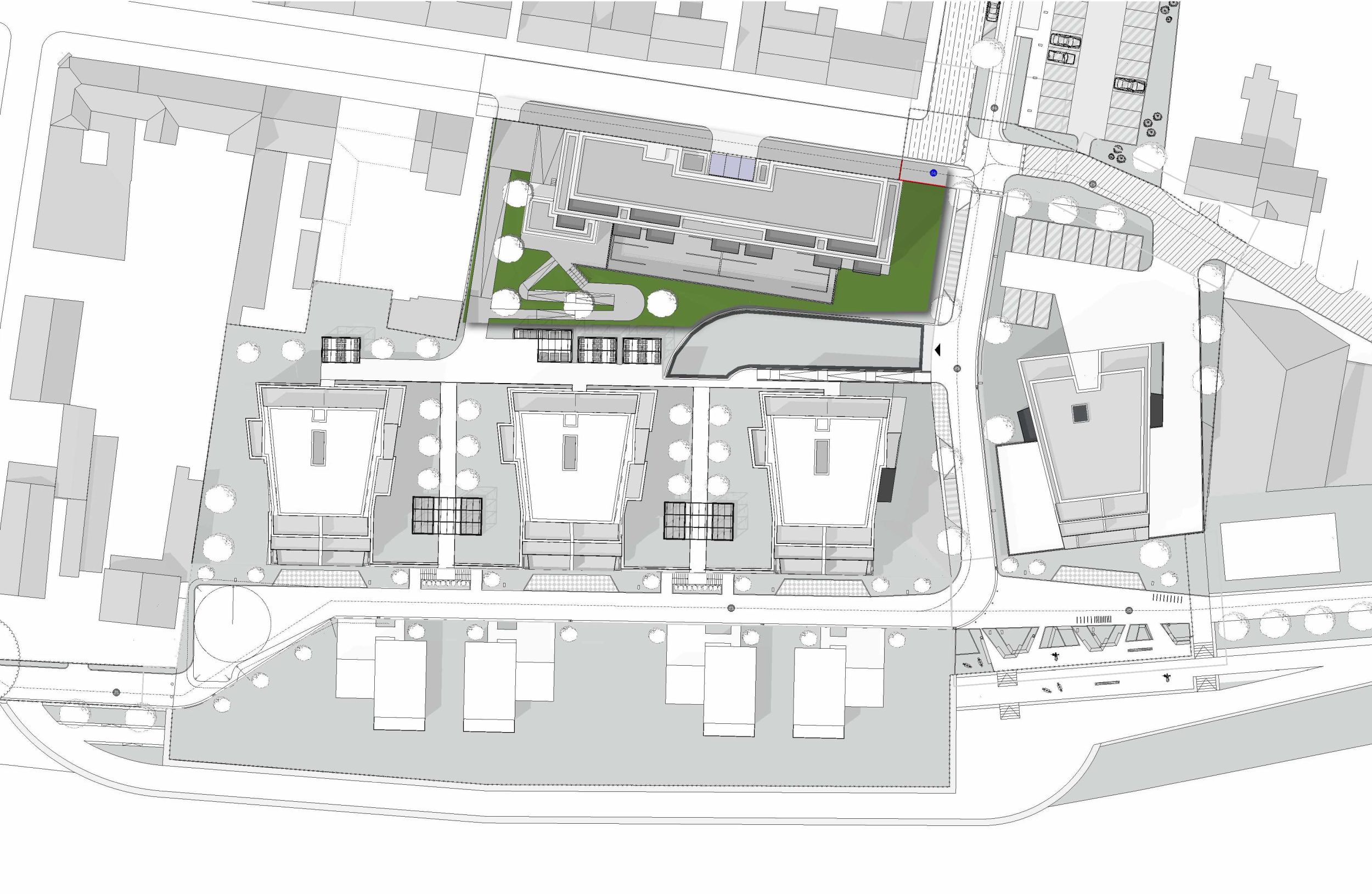 Der zweite Bauabschnitt bildet eine straßenbegleitende Zeile. Durch horizontale und vertikale Vor- und Rücksprünge greift das Gebäude die kleinteilige Umgebungsstruktur auf und fügt sich harmonisch in das Ensemble ein.
