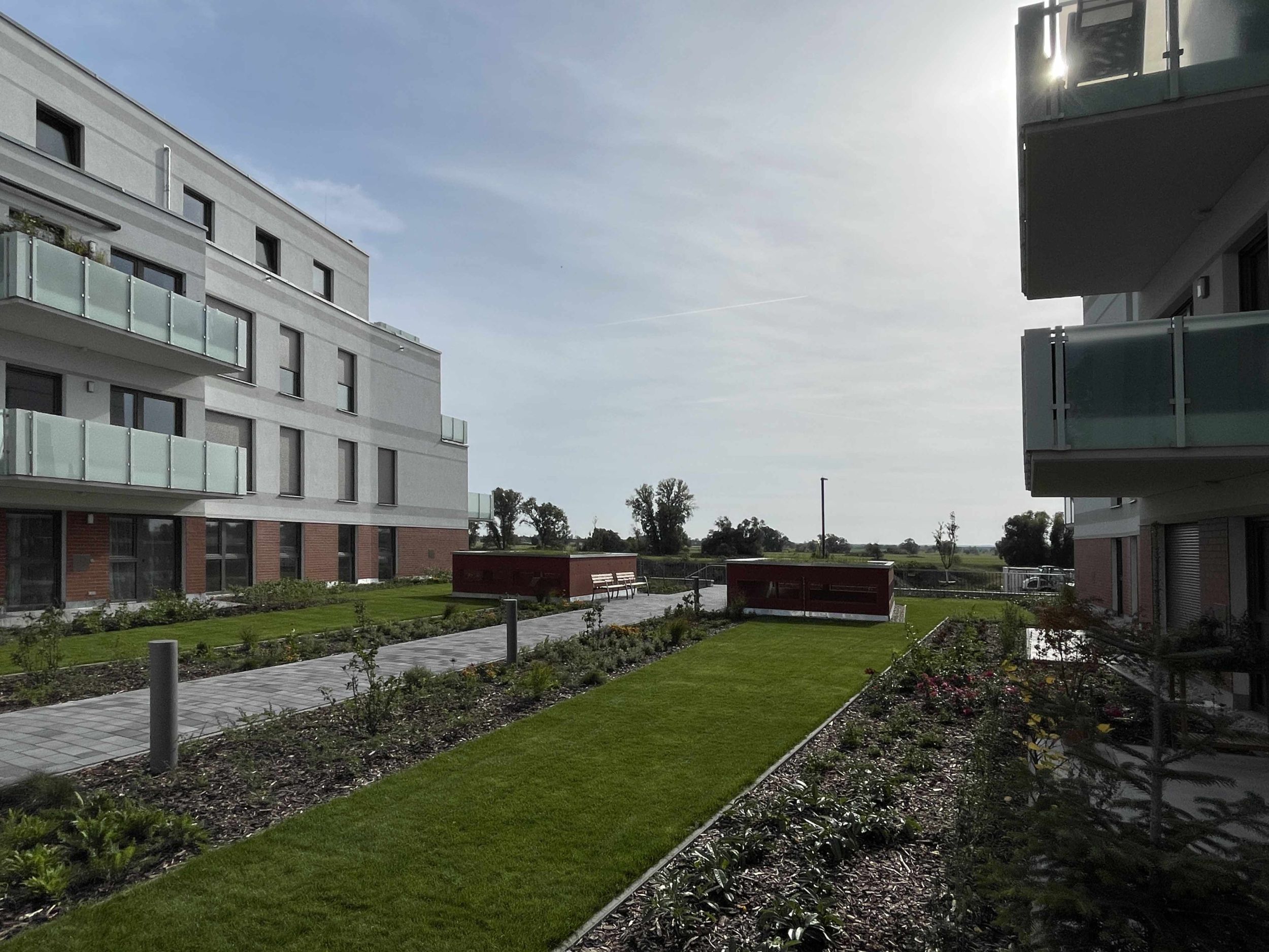 Der erste Bauabschnitt umfasst drei Wohngebäude mit insgesamt 44 Wohnungen. Sämtliche Wohnungen sind zur Elbe und zur weiten Auenlandschaft ausgerichtet. Eine gemeinsame Tiefgarage verbindet alle Gebäude. Sie ist als geschlossene Großgarage mit natürlichen Lüftungsöffnungen geplant. Das Dach der Tiefgarage bildet zwischen den Gebäuden eine begehbare, begrünte Innenhoffläche. Auch die Tiefgaragenzufahrt sowie die Lüftungselemente sind landschaftlich integriert und begrünt.